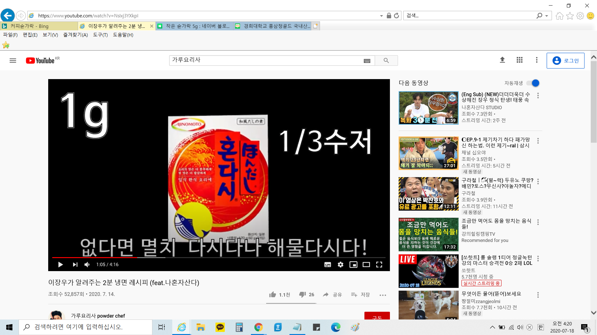 2. 혼다시 넣는 요리 유튜버? 저는 많이 본적 없습니다.  혼다시를 다시다나 해물다시다 대체가능 이라는 자료를 보고