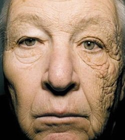 이 사진은 오른쪽만 자외선에 노출되어 피부 노화를 나타낸 사진입니다.